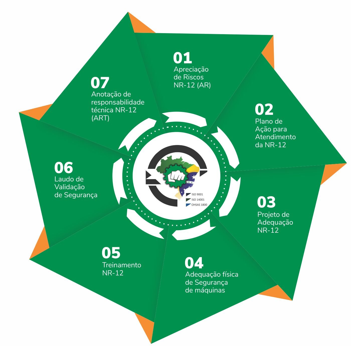 Conta com o suporte de profissionais especializados como engenheiros da área mecânica, segurança do trabalho e elétrica, além de setores de montagens elétricas, mecânica, pintura e logística para lhes apresentar o melhor plano de segurança para o equipamento em questão levando em conta o custo x benefício, a segurança completa do equipamento e a produtividade do mesmo. A empresa que formaliza o projeto de adequação NR-12 garante: Adequação NR-12 desde o projeto até execução; Fabricação de proteções mecânicas; Instalação de componentes de segurança.